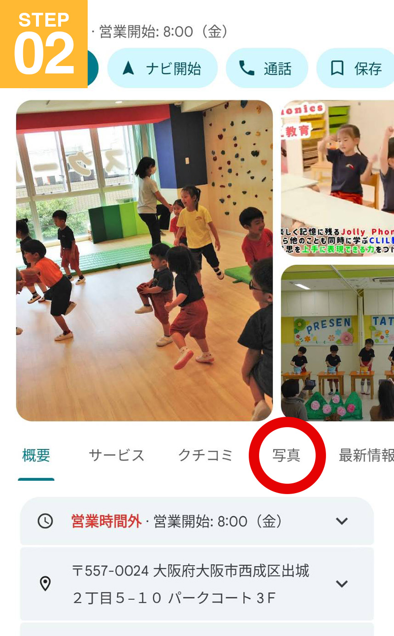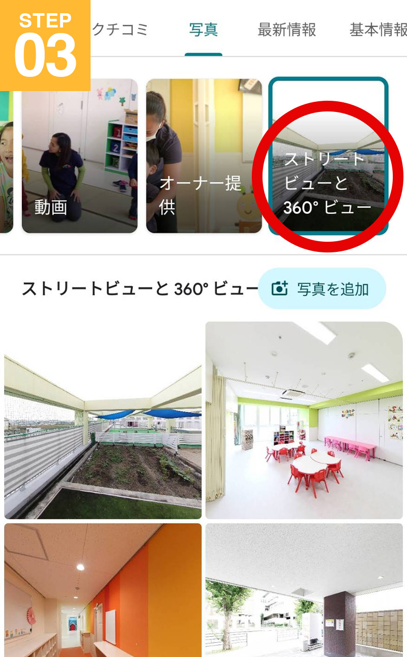 Googleマップを開いたら、「写真」タブをクリック。